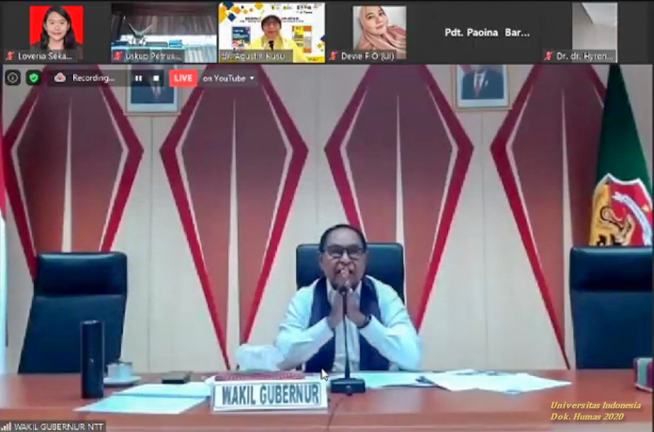 KabarLagi.Com–Universitas Indonesia (UI) melalui Disaster Risk Reduction Centre (DRRC UI) menggagas seminar bertajuk “Pentahelix NTT Lawan COVID-19”. Kegiatan tersebut berlangsung secara virtual pada Jumat (4/9). Tujuan kegiatan ini adalah untuk melihat kisah dan kiat sukses masing-masing daerah dalam menangani COVID-19, sebagaimana tertuang di dalam Buku “Pengalaman Indonesia Menangani Wabah COVID-19” dan Buku Saku “Desa Tangguh Bencana Lawan COVID-19” karya sivitas akademika UI. Sebelumnya, DRRC UI juga telah menggelar webinar dengan pembahasan serupa di Provinsi Sumatera Barat dan Maluku. Kegiatan ini terselenggara berkat dukungan dan kerja sama dari Badan Nasional Penanggulangan Bencana (BNPB), Pemerintah Provinsi NTT, Asosiasi Institusi Pendidikan Tinggi Kesehatan Masyarakat Indonesia (AIPTKMI), TP-PKK NTT, Universitas Nusa Cendana, Ikatan Ahli Kesehatan Masyarakat Indonesia (IAKMI), dan Perhimpunan Ahli Kesehatan Kerja Indonesia (PAKKI).