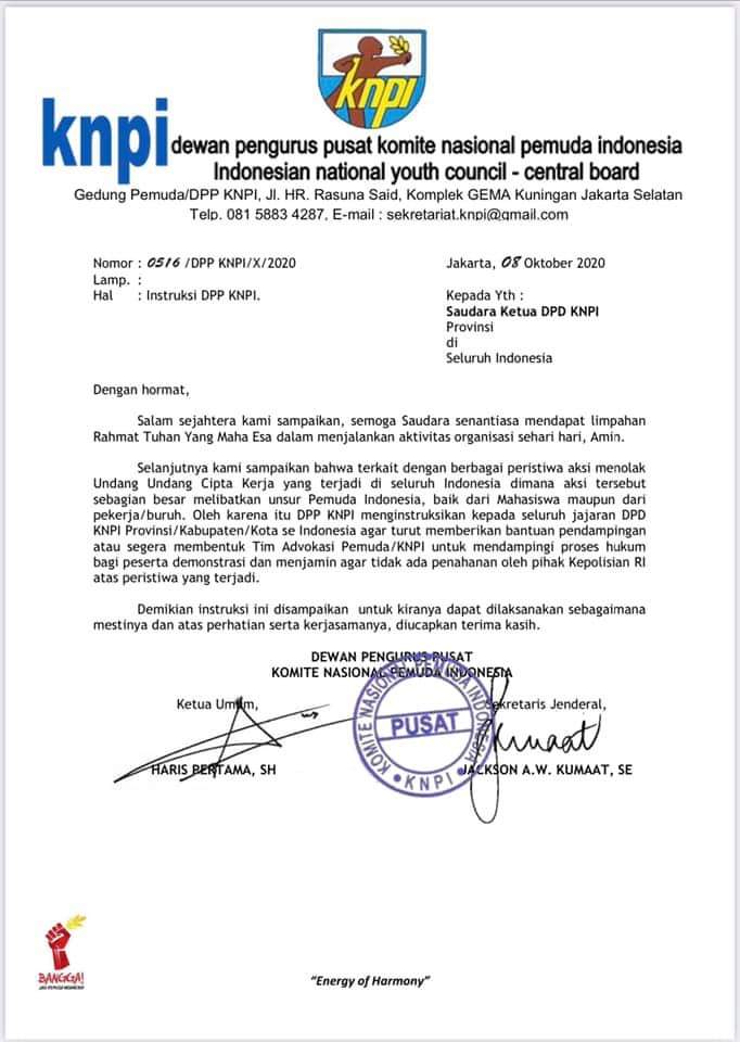 Intruksi tersebut dituangkan Haris dalam surat nomor: 0516/DPP KNPI/X/2020, Hal: Intruksi DPP KNPI.