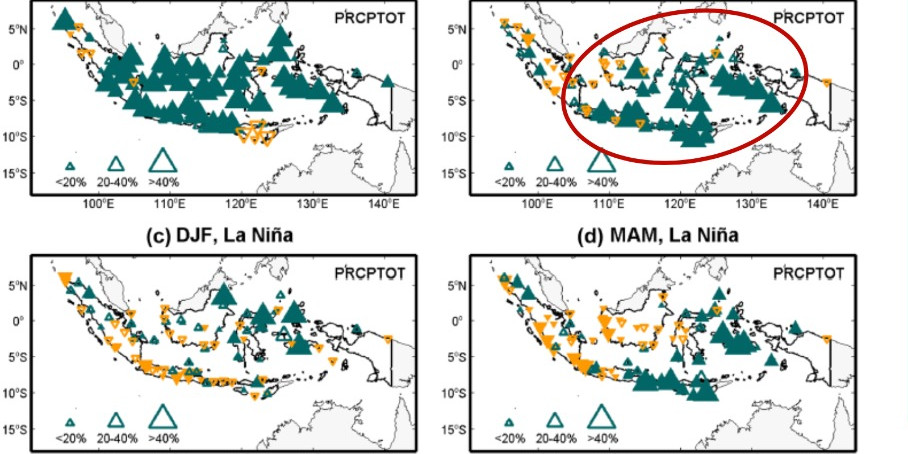 Sedangkan pada Desember, Januari dan Februari, dampak La Nina di wilayah tengah hingga utara Indonesia.