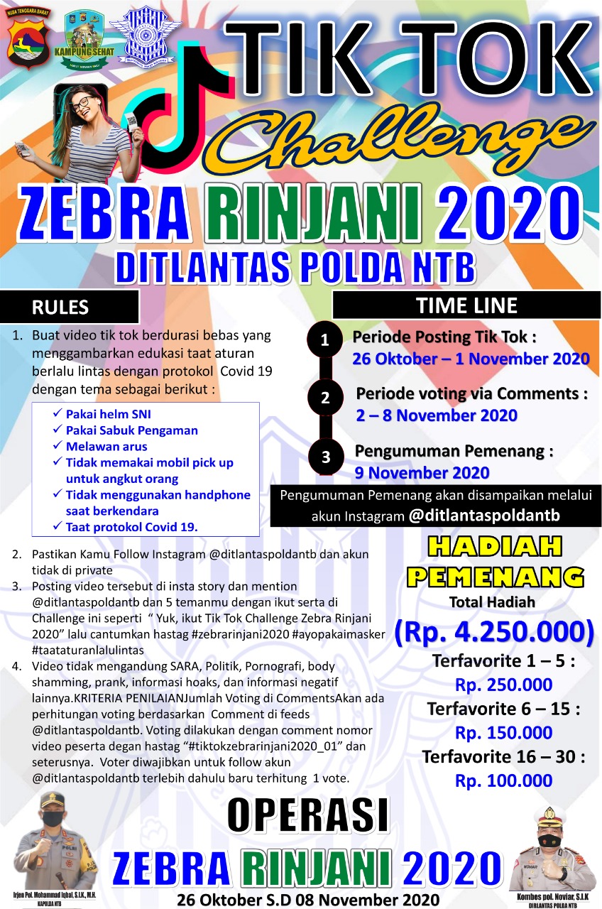 Ditlantas Polda NTB melalui akun Instagramnya saat ini sedang menyelenggarakan sebuah lomba video berhadiah di media sosial Instagram dengan tema “TikTok challange Zebra Rinjani 2020”.