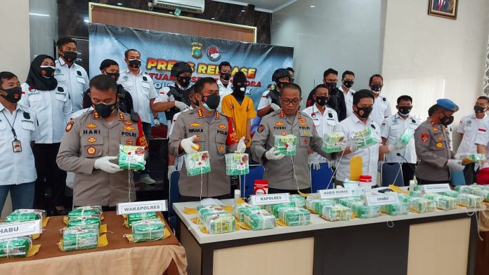KabarLagi.Com– Seorang pengedar narkoba dengan barang bukti 46 Kilogram sabu-sabu barhasil ditangkap anggota Satresnarkoba Polres Metro Kota Depok di sebuah hotel daerah Padang, Sumatera Barat, Senin (18/1/2021). Penangkapan terhadap bandar narkoba jaringan internasiolan tersebut dimulai dari penangkapan pelaku awal di Kota Depok.