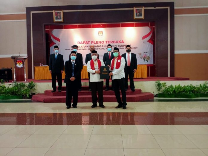KabarLagi.Com— Komisi pemiliham Umum (KPU) Kota Depok secara resmi menentapkan calon pasangan Idris-Imam sebagai calon Walikota dan Wakil Walikota Depok 2020. Penetapan tersebut dihadiri oleh jajaran Forkopimda serta jajaran vertikal lain nya dan para pimpinan partai pengusung No 02 Hj Qonita Lutfiyah dari PPP, Hafis Nasir dari PKS, dan Edi Sitorus dari Partai Demokrat dan kegiatan tersebut berlangsung di Hotel Bumi Wiyata Jalan Margonda Depok Kamis (21/1).