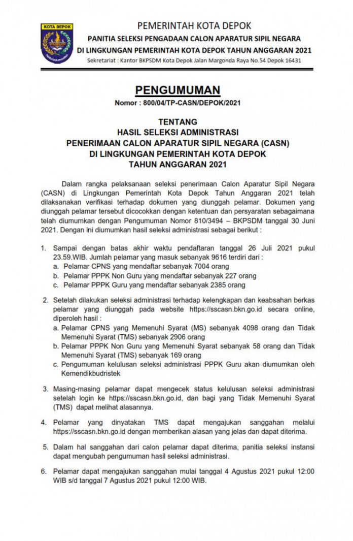 KabarLagi.Com – Pemerintah Kota (Pemkot) Depok melalui panitia seleksi pengadaan Calon Aparatur Sipil Negara (CASN) resmi mengumumkan hasil seleksi administrasi penerimaan CASN Kota Depok Tahun Anggaran 2021. Hal tersebut tertuang dalam Surat Pengumuman Nomor: 800/04/TP-CASN/DEPOK/2021 tentang Hasil Seleksi Administrasi Penerimaan CASN di Lingkungan Pemkot Depok Tahun Anggaran 2021.
