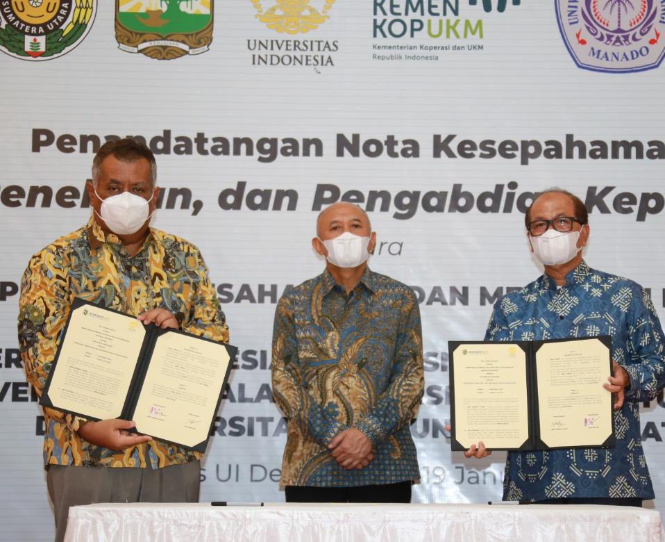 Pada acara yang sama, sekaligus dilakukan penandatanganan nota kesepahaman dengan empat Perguruan Tinggi Negeri lain di Indonesia, yakni Universitas Sumatera Utara (USU), Universitas Andalas (UNAND), Universitas Sam Ratulangi, dan Universitas Lambung Mangkurat. Selain seremoni penandatanganan, diadakan sesi sharing bersama dengan moderator Direktur Direktorat Pengabdian dan Pemberdayaan Masyarakat UI Agung Waluyo, S.Kp., M.Sc., Ph.D., dengan narasumber Deputi Bidang Kewirausahaan, Kementerian Koperasi dan UKM Siti Azizah dan Direktur Inovasi dan Science Techno Park UI Ahmad Gamal, dengan tema “Inkubasi Bisnis untuk Mendorong Lahirnya UKM Inovatif Nasional”.