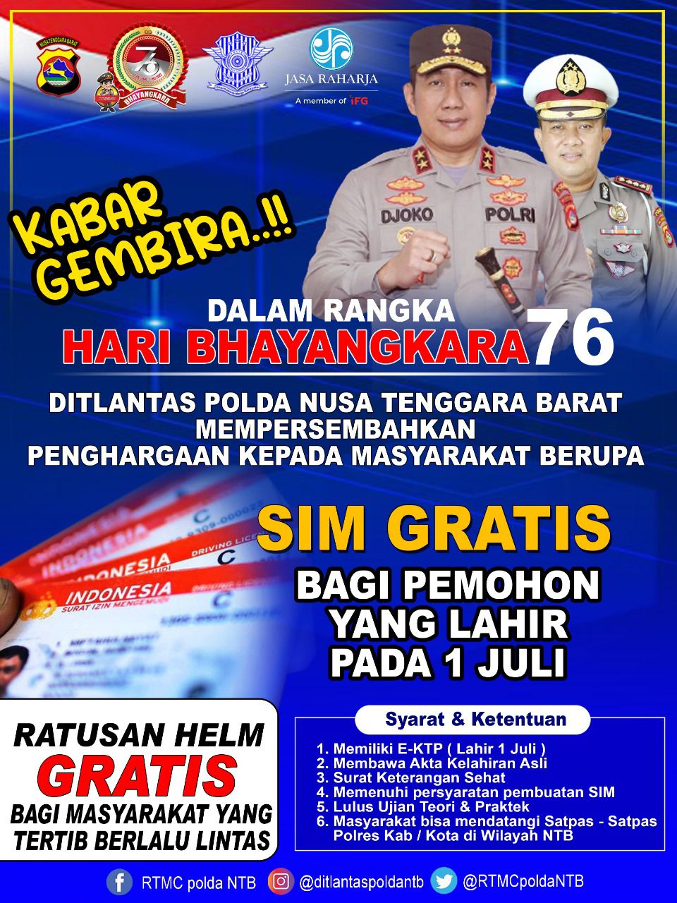 Direktur Lalu Lintas Polda NTB Kombes Pol Djoni Widodo S.I.K mengatakan, pemberian SIM gratis ini ada ketentuannya. Selain harus yang lahir pada 1 Juli dan sudah cukup umur, lulus ujian teori dan praktek.