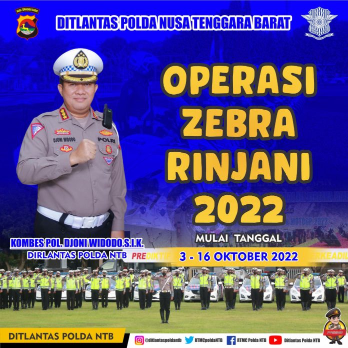KabarLagi.Com — Polda NTB akan melaksanakan Operasi Zebra Rinjani 2022 akan pada 3 -16 Oktober 2022, Operasi Zebra Rinjani tahun ini memprioritaskan penggunaan tilang elektronik dengan teguran simpatik. Demikian dijelaskan Direktur Lalu Lintas Polda NTB Kombes Pol Djoni Widodo S.I.K pada hari Sabtu, 1 Oktober 2022 di Mataram.