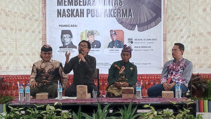 KabarLagi.Com – Dalam rangka memperkenalkan dan menamkan nilai-nilai yang terdapat didalam koleksi Naskah kepada masyarakat, Museum Negeri NTB menggelar Diskusi Bedah Naskah bertajuk ‘Membedah Tuntas Naskah Puspakerma’ di Aula Samalas Museum NTB, Selasa (13/6/2023).