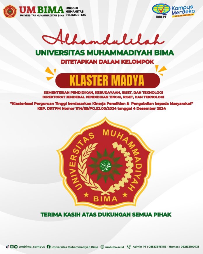 KabarLagi.Com –Berdasarkan Keputusan Direktur Riset, Teknologi, dan Pengabdian kepada Masyarakat Kemendikbud Ristekdikti RI Nomor 1114/E5/PG.02.00/2024 tanggal 4 Desember 2024 tentang Penetapan Klasterisasi Perguruan Tinggi berdasarkan Kinerja Penelitian dan Pengabdian kepada Masyarakat menempatkan Universitas Muhammadiyah Bima pada Peringkat atau Klaster Madya dari jumlah 1.115 Perguruan Tinggi Penyelenggara Akademik yang masuk klasterisasi dan masih ada ratusan perguruan tinggi lainnya yang belum masuk klasterisasi pada tahun 2025.