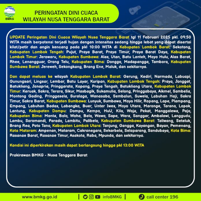 KabarLagi.Com--Badan Meteorologi, Klimatologi, dan Geofisika (BMKG) mengeluarkan peringatan dini cuaca ekstrem untuk wilayah Nusa Tenggara Barat pada Selasa, 11 Februari 2025. BMKG memperkirakan hujan dengan intensitas sedang hingga lebat disertai petir dan angin kencang akan terjadi di beberapa daerah.
