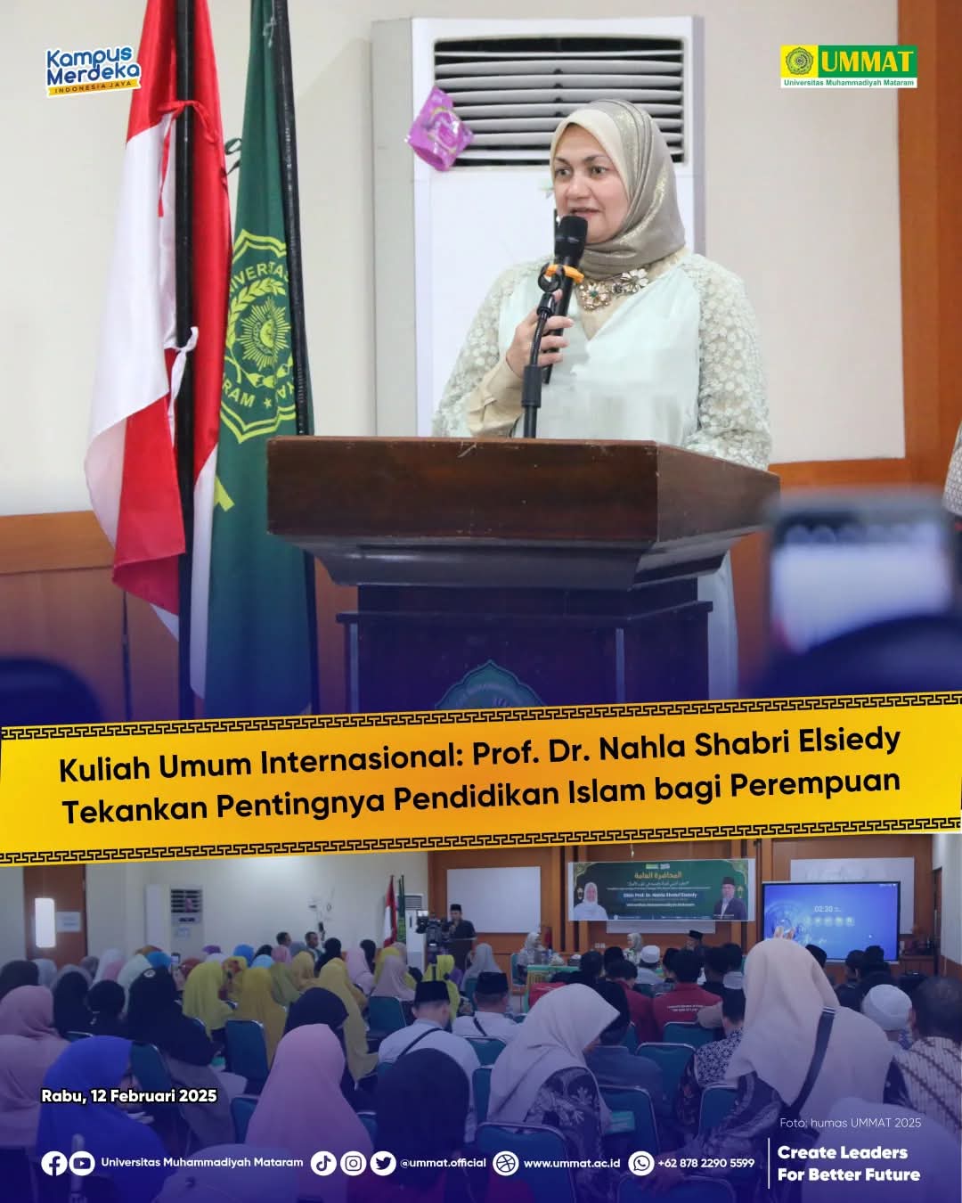 KabarLagiMataram – Universitas Muhammadiyah Mataram (UMMAT) terus berkomitmen dalam memperkuat pendidikan agama dan pemberdayaan perempuan sebagai pilar utama dalam membangun peradaban. Dalam kuliah umum bertajuk “Pendidikan Agama bagi Perempuan dan Pentingnya dalam Membentuk Generasi”, Prof. Nahla, penasihat Grand Syaikh Al-Azhar Kairo sekaligus Dekan Fakultas Agama Islam Al-Azhar University, menekankan bahwa perempuan memiliki peran strategis dalam membangun generasi unggul melalui pendidikan agama.